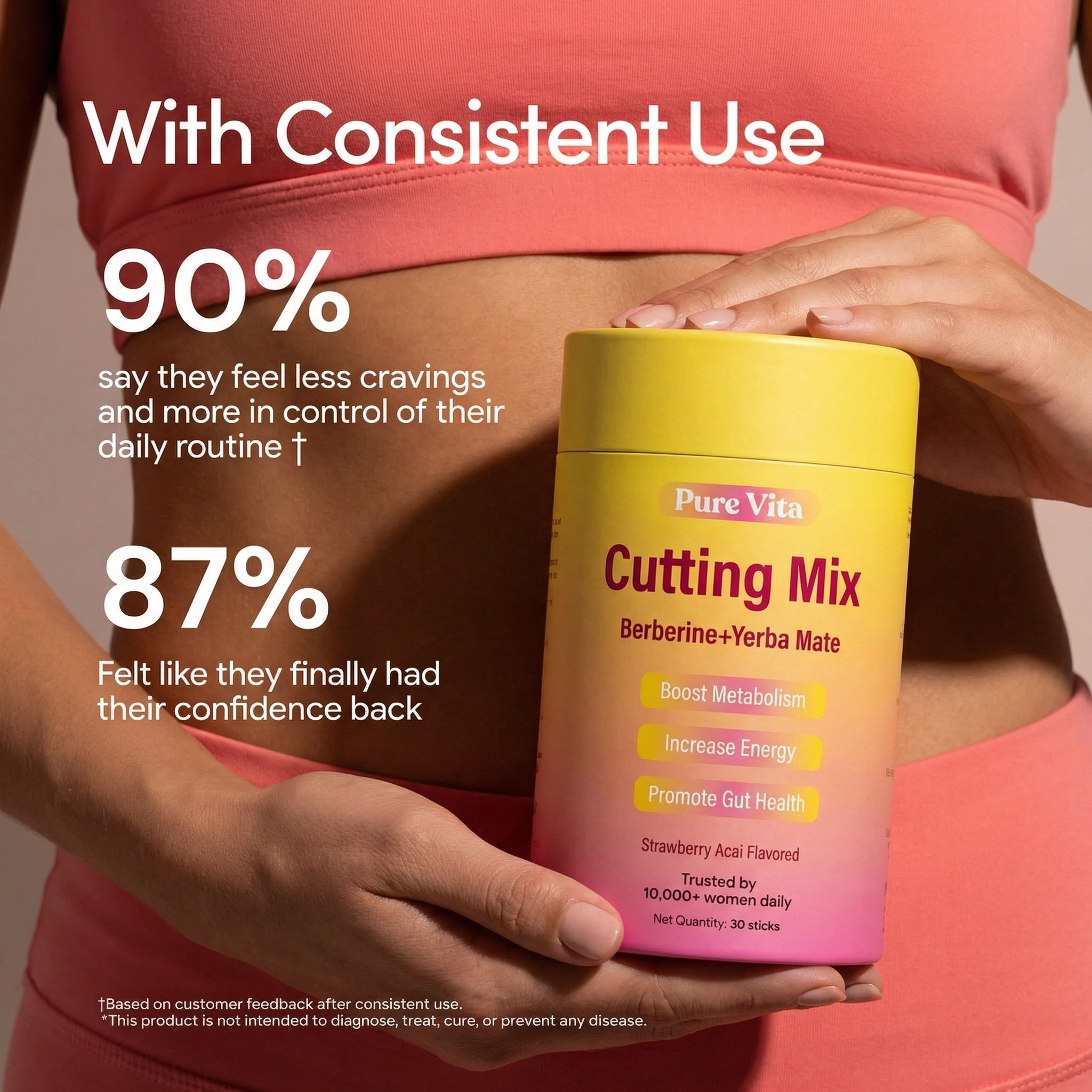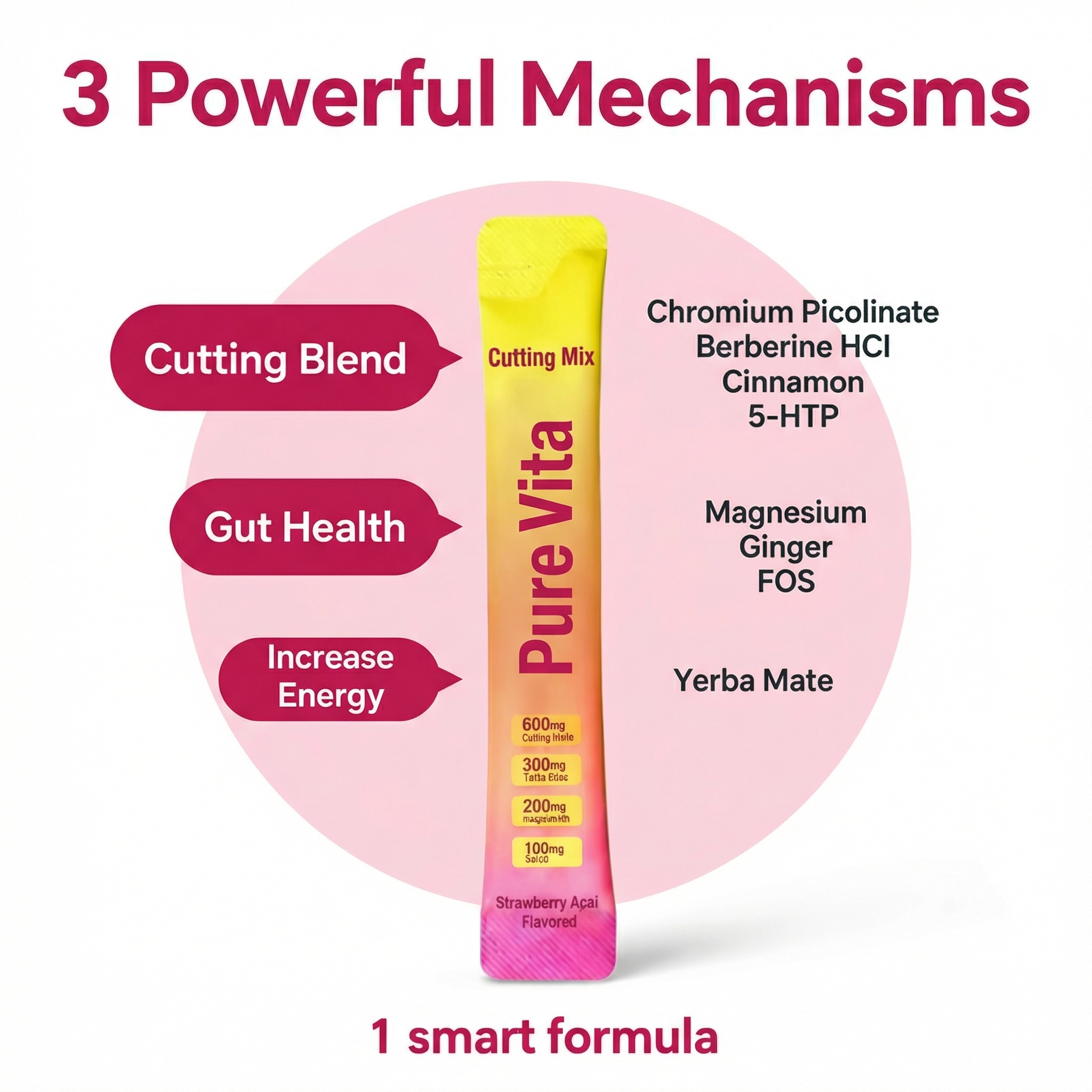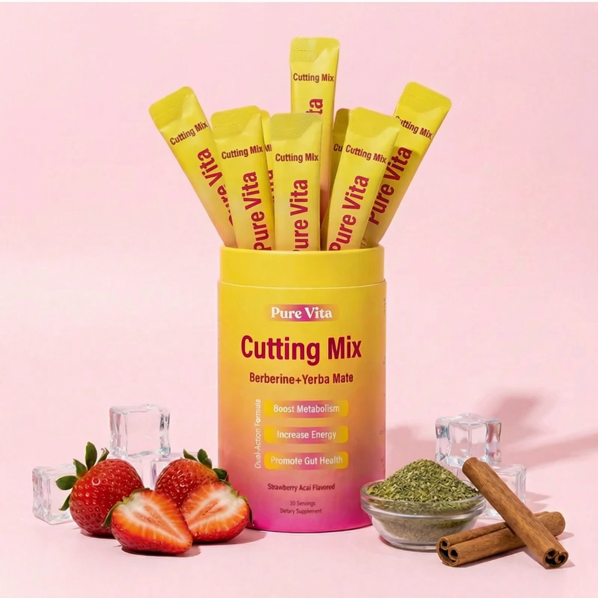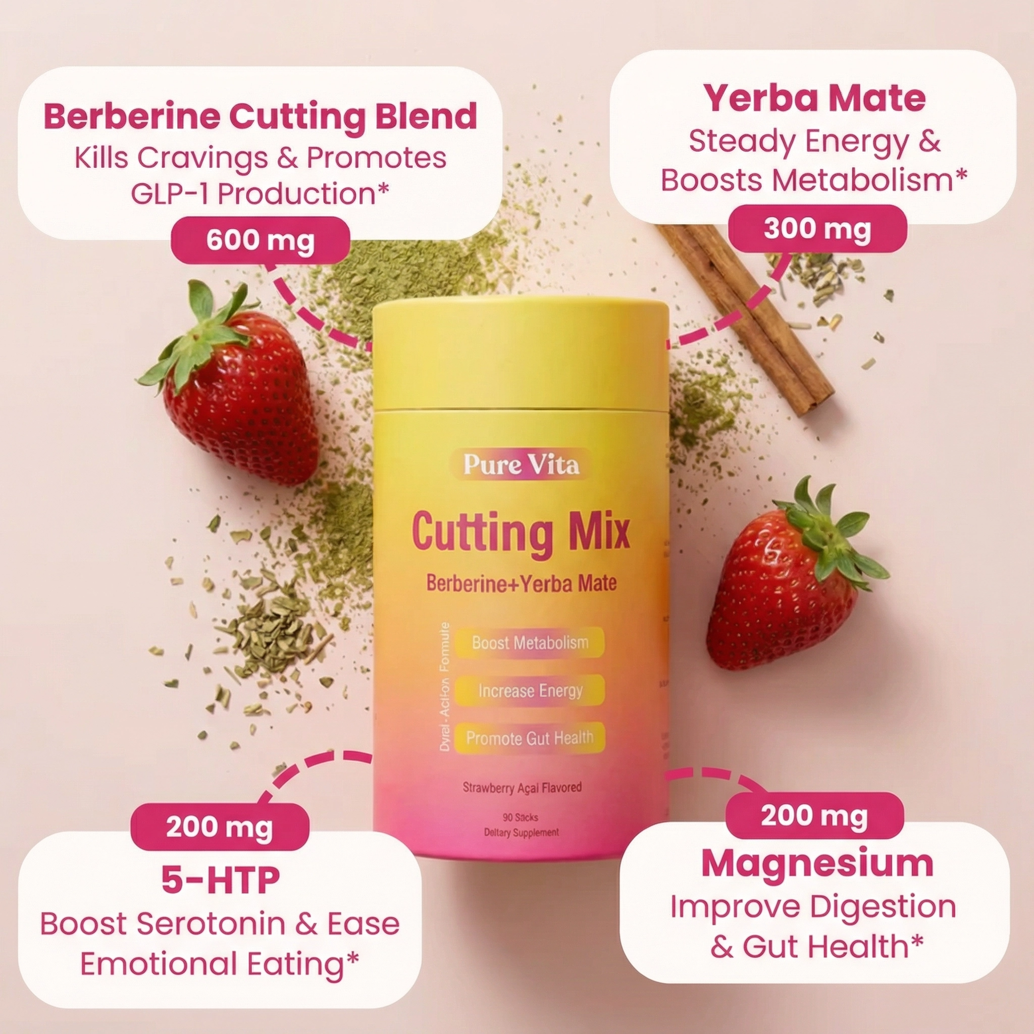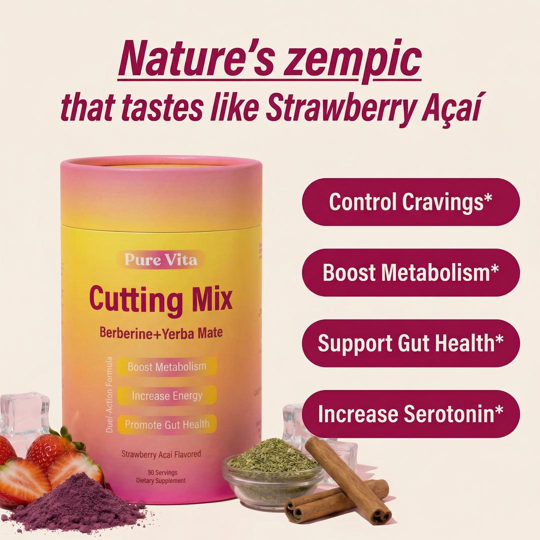 Berberine & Yerba Mate Cutting Mix — formulated for women to crush cravings, boost serotonin, and flatten your stomach. Tastes like Strawberry Açaí.